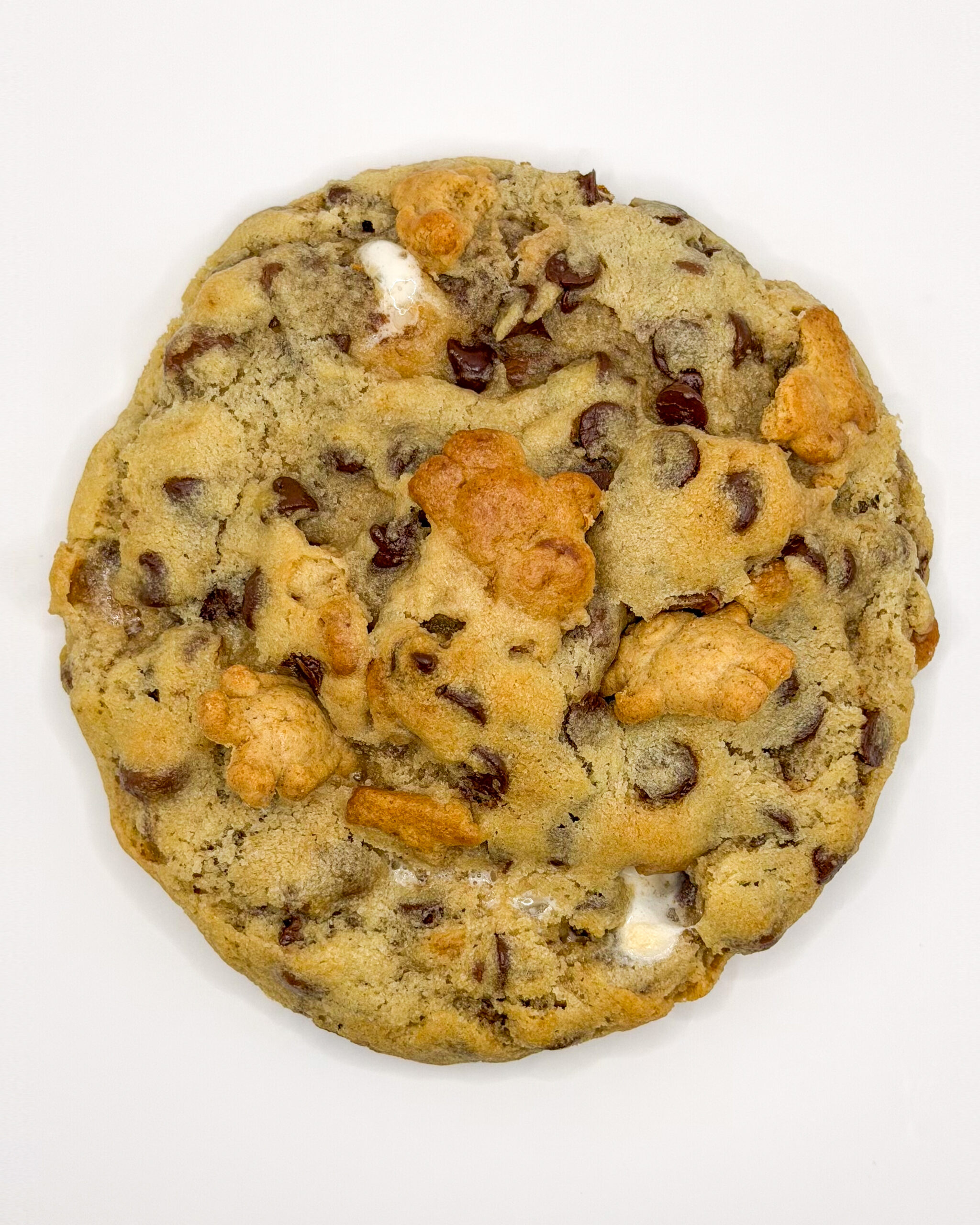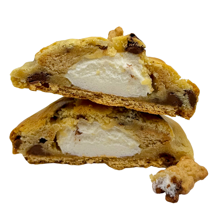 A decadent Belgian chocolate cookie with a graham cracker base, stuffed with marshmallows infused with classic s’mores flavor, baked to ooze just like the real thing. Garnished with Teddy Grahams for extra crunch and nostalgia.