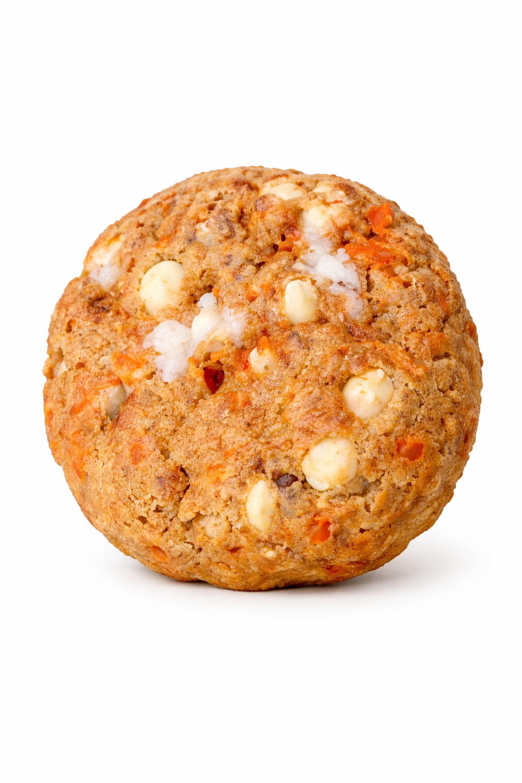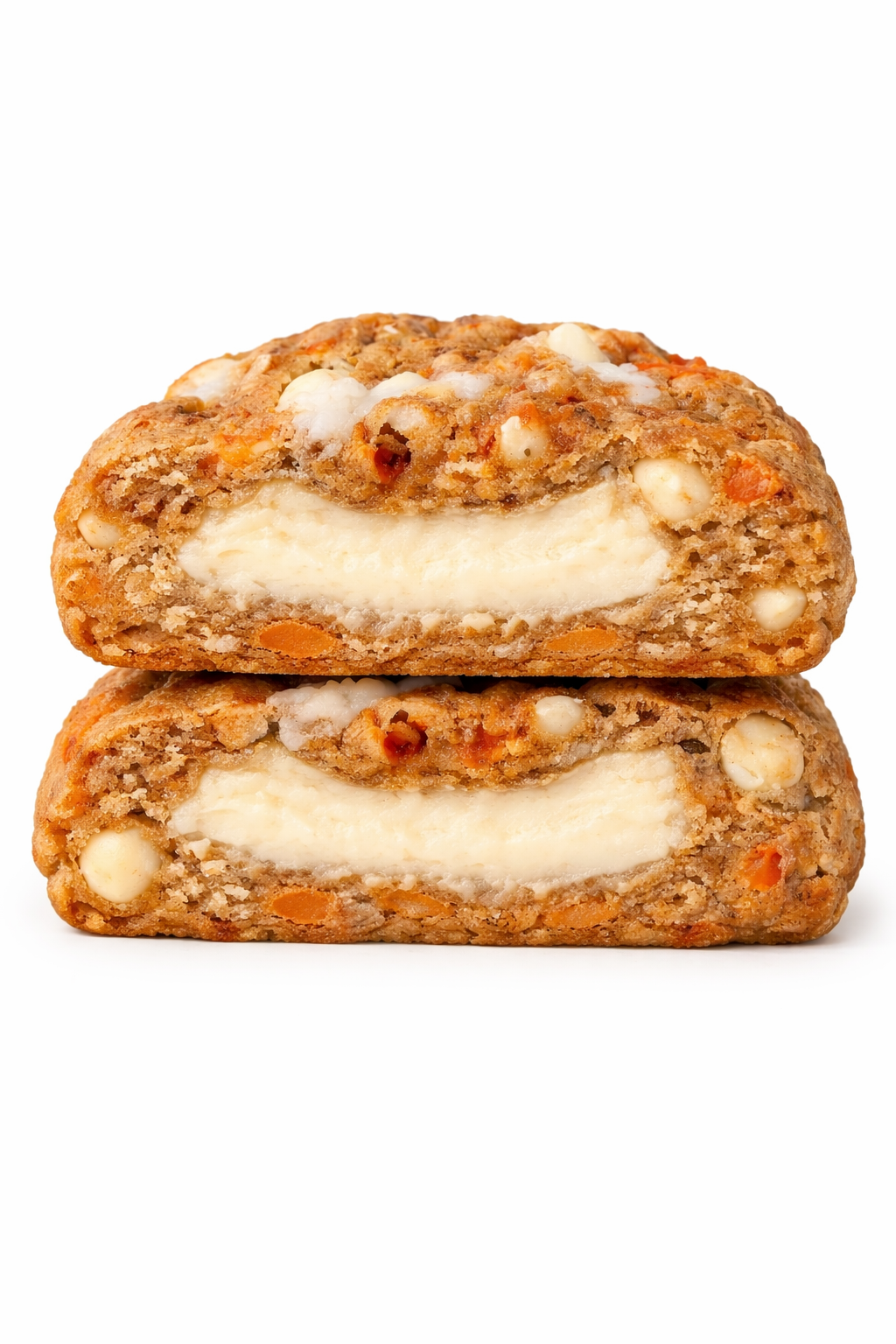A soft carrot cake cookie packed with fresh carrots, cinnamon and other warm spices, crunchy walnuts and pecans, and sweet white chocolate—filled with a creamy cheesecake center for the perfect cozy bite.