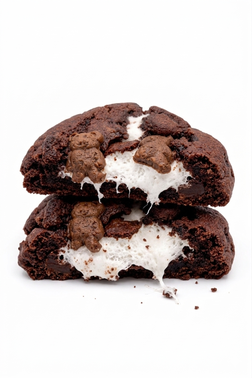 A decadent Dutch‑chocolate cookie layered with milk chocolate, Oreo pieces, and chocolate bears, finished with a soft marshmallow center.